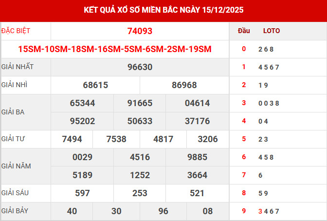 Ngày 15/12/2025, giải đặc biệt của Xổ số Miền Bắc thuộc về dãy số 74093, trong đó cặp 93 là tâm điểm dành cho những ai quan tâm tới các dấu hiệu lặp lại.