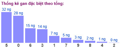 Thống kê cho thấy tổng đề lâu chưa xuất hiện nhất là tổng 5 (bao gồm 10 cặp số: 05, 14, 23, 32, 41, 50, 69, 78, 87, 96) đã 32 ngày chưa ra.