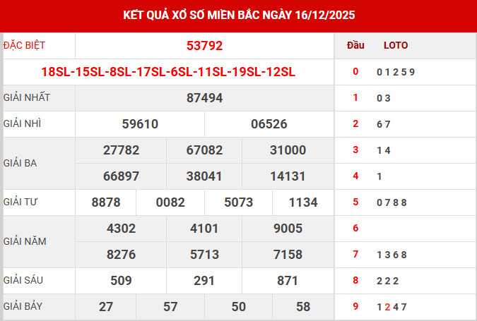 Ngày 16/12/2025, giải đặc biệt của Xổ số Miền Bắc thuộc về dãy số 53792, trong đó cặp 92 là tâm điểm dành cho những ai quan tâm tới các dấu hiệu lặp lại.