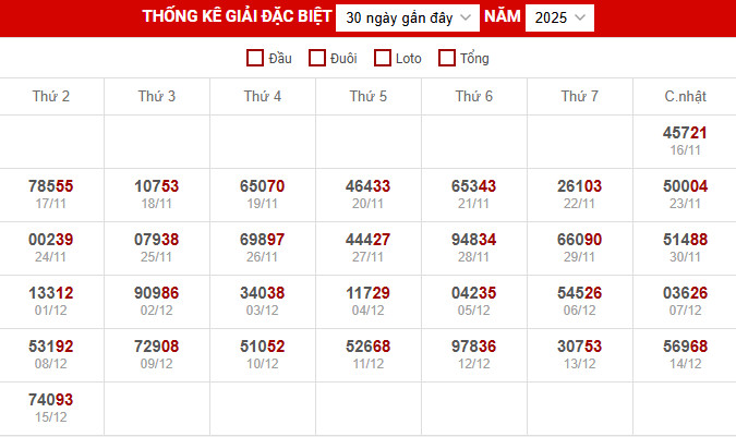 Song song với đó, giải đặc biệt trong suốt 10' tuần gần đây đã được phân tích kỹ lưỡng, giúp phơi bày những quy luật tiềm ẩn. Người chơi khi kết hợp dữ liệu khách quan này với kinh nghiệm cá nhân sẽ có thêm lợi thế trong hành trình tìm kiếm vận may.