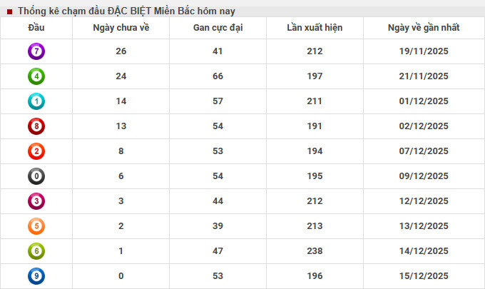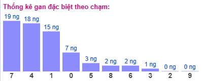Thống kê cho thấy chạm đề lâu chưa xuất hiện nhất là chạm 7 (bao gồm 19 cặp số có chứa số 7), đã 19 ngày chưa ra.