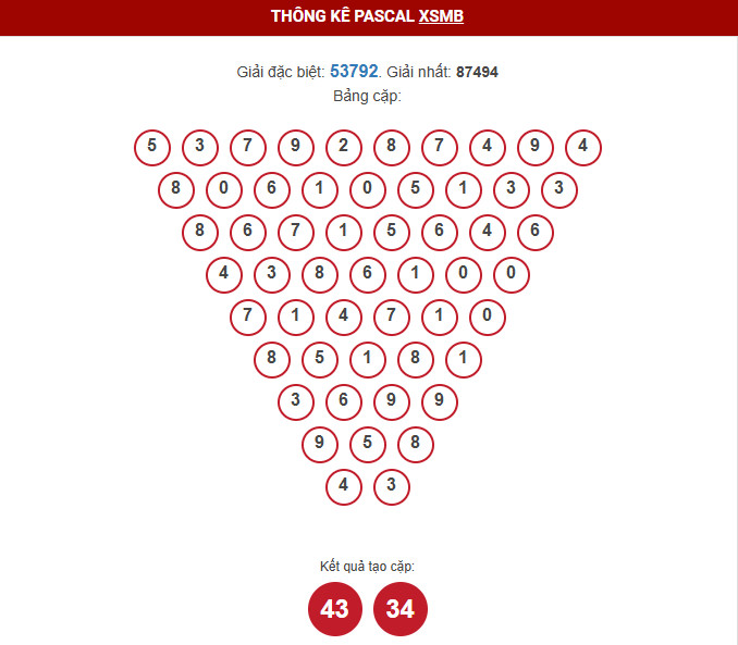 - Dựa vào thống kê Pascal, tham khảo cặp số đặc biệt dễ ra : 43 - 34