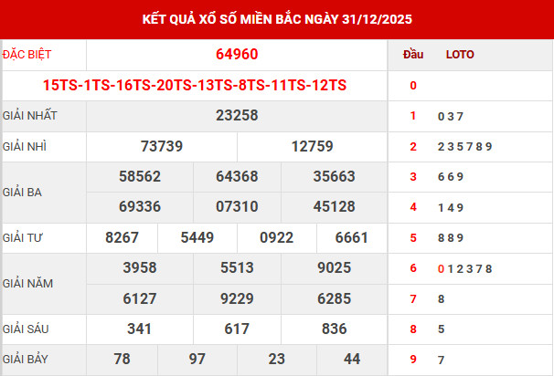 Căn cứ vào bảng kết quả xổ số miền Bắc ngày 31/12/2026 vừa được công bố, các chuyên gia tiến hành tổng hợp và phân tích các số liệu trọng tâm, qua đó mang đến những nhận định chi tiết nhằm hỗ trợ bạn đọc tham khảo và dự đoán XSMB 1/1/2026 một cách hiệu quả.