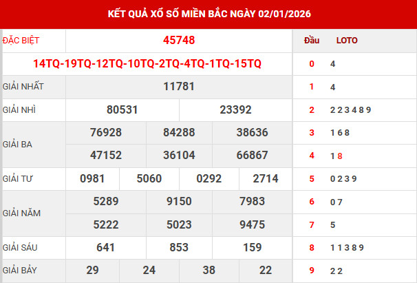 Căn cứ vào bảng kết quả xổ số miền Bắc ngày 2/1/2026 vừa được công bố, các chuyên gia tiến hành tổng hợp và phân tích các số liệu trọng tâm, qua đó mang đến những nhận định chi tiết nhằm hỗ trợ bạn đọc tham khảo và dự đoán XSMB 3/1/2026 một cách hiệu quả.