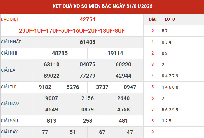 Căn cứ vào bảng kết quả xổ số miền Bắc ngày 31/1/2026 vừa được công bố, các chuyên gia tiến hành tổng hợp và phân tích các số liệu trọng tâm, qua đó mang đến những nhận định chi tiết nhằm hỗ trợ bạn đọc tham khảo và dự đoán XSMB 1/2/2026 một cách hiệu quả.