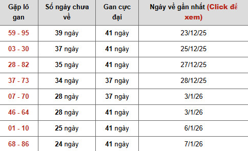 Nổi bật nhất là cặp 59 – 95, hiện đã 39 ngày chưa xuất hiện, chỉ còn cách mốc gan cực đại 41 ngày đúng 2 ngày, lần về gần nhất ghi nhận 23/12/2025. Trạng thái gan cận đỉnh kéo dài cho thấy áp lực giải tỏa đang ở mức rất cao, khiến cặp số này trở thành tâm điểm cần cân nhắc trong các phương án dự đoán xổ số miền bắc ngày 1/2/2026 chuẩn xác.