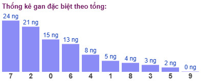 ​Thống kê cho thấy tổng đề lâu chưa xuất hiện nhất là tổng 7 (bao gồm 10 cặp số: 07, 16, 25, 34, 43, 52, 61, 70, 89, 98) đã 24 ngày chưa ra.