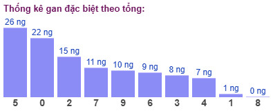 Thống kê cho thấy tổng đề lâu chưa xuất hiện nhất là tổng 5 (bao gồm 10 cặp số: 05, 14, 23, 32, 41, 50, 69, 78, 87, 96) đã 26 ngày chưa ra.