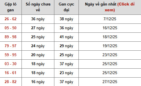 Nổi bật nhất là cặp 26 – 62, hiện đã 36 ngày chưa xuất hiện, chỉ còn cách mốc gan cực đại 38 ngày đúng 2 ngày, lần về gần nhất ghi nhận 07/12/2025. Trạng thái gan cao, tiến sát vùng nhạy cảm cho thấy áp lực giải tỏa đang tăng mạnh, khiến cặp số này trở thành điểm cần lưu ý trong các phương án dự đoán xổ số miền bắc chuẩn xác.
