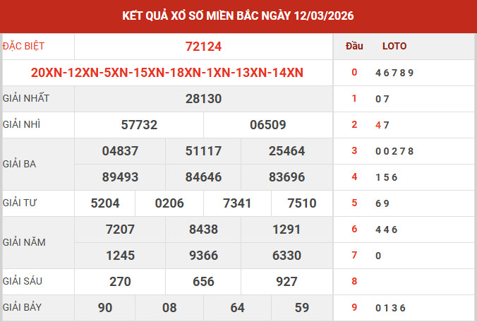 Căn cứ vào bảng kết quả xổ số miền Bắc ngày 12/3/2026 vừa được công bố, các chuyên gia tiến hành tổng hợp và phân tích các số liệu trọng tâm, qua đó mang đến những nhận định chi tiết nhằm hỗ trợ bạn đọc tham khảo và dự đoán XSMB 13/3/2026 một cách hiệu quả.