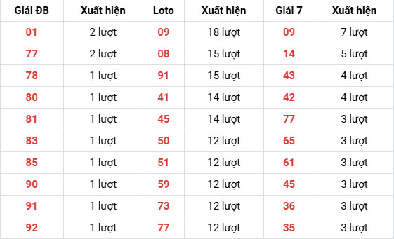 Hai số 01 và 77 đều xuất hiện 2 lượt, là những số có tần suất cao nhất trong cột giải đặc biệt.