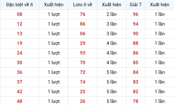 Giải 7 ít xuất hiện: 96, 94, 90, 88, 86, 85, 84, 83, 82, 78.