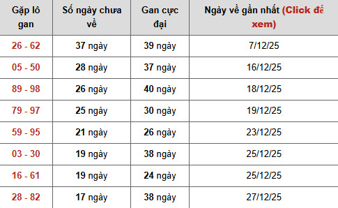 Nổi bật nhất là cặp 26 – 62, hiện đã 37 ngày chưa xuất hiện, chỉ còn cách mốc gan cực đại 39 ngày đúng 2 ngày, lần về gần nhất ghi nhận 07/12/2025. Trạng thái gan cận đỉnh cho thấy áp lực giải tỏa đang ở mức cao, khiến cặp số này trở thành tâm điểm cần cân nhắc trong các phương án dự đoán xổ số miền bắc ngày 14/1 chuẩn xác.