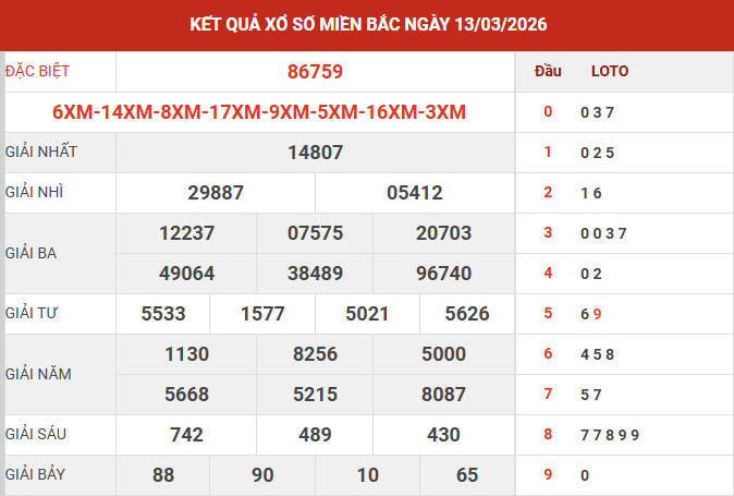 Căn cứ vào bảng kết quả xổ số miền Bắc ngày 13/3/2026 vừa được công bố, các chuyên gia tiến hành tổng hợp và phân tích các số liệu trọng tâm, qua đó mang đến những nhận định chi tiết nhằm hỗ trợ bạn đọc tham khảo và dự đoán XSMB 14/3/2026 một cách hiệu quả.