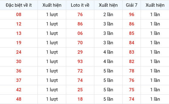 Các số 08, 12, 13, 19, 24, 30, 36, 37, 42, 48 đều chỉ xuất hiện 1 lượt trong bảng thống kê giải đặc biệt.