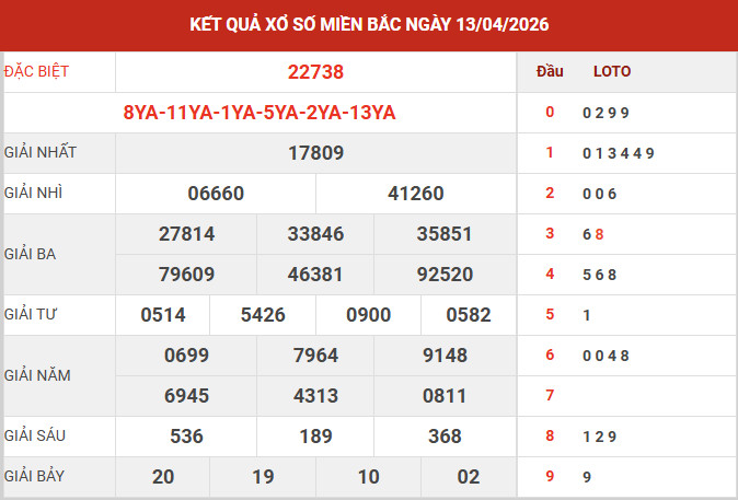 Căn cứ vào bảng kết quả xổ số miền Bắc ngày 13/4/2026 vừa được công bố, các chuyên gia tiến hành tổng hợp và phân tích các số liệu trọng tâm, qua đó mang đến những nhận định chi tiết nhằm hỗ trợ bạn đọc tham khảo và dự đoán XSMB 14/4/2026 một cách hiệu quả.