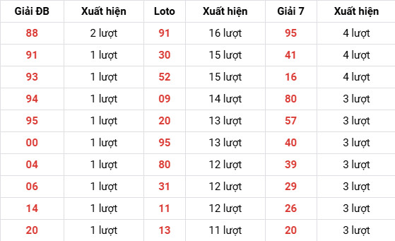 Các số 91, 93, 94, 95, 00, 04, 06, 14, 20 (1 lượt) → phân bố rải rác, chưa có xu hướng rõ ràng.