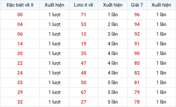 Các số: 00, 04, 06, 14, 20, 22, 24, 25, 29, 32 đều xuất hiện 1 lượt
