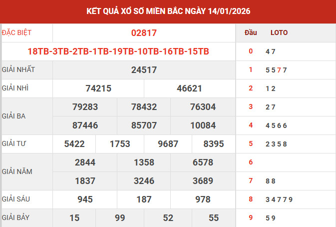 Căn cứ vào bảng kết quả xổ số miền Bắc ngày 14/1/2026 vừa được công bố, các chuyên gia tiến hành tổng hợp và phân tích các số liệu trọng tâm, qua đó mang đến những nhận định chi tiết nhằm hỗ trợ bạn đọc tham khảo và dự đoán XSMB 15/1/2026 một cách hiệu quả.