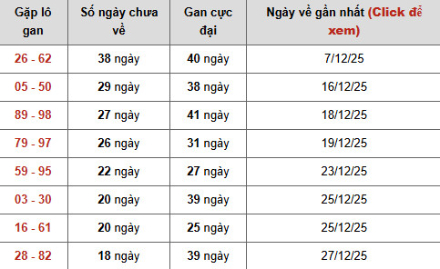Nổi bật nhất là cặp 26 – 62, hiện đã 38 ngày chưa xuất hiện, chỉ còn cách mốc gan cực đại 40 ngày đúng 2 ngày, lần về gần nhất ghi nhận 07/12/2025. Trạng thái gan cận đỉnh kéo dài cho thấy áp lực giải tỏa đang ở mức rất cao, khiến cặp số này trở thành tâm điểm cần cân nhắc trong các phương án dự đoán xổ số miền bắc ngày 15/1/2026 chuẩn xác.