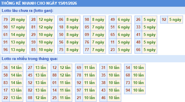 ​Thống kê lô tô miền Bắc nhanh ngày 15/1/2026