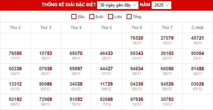Song song với đó, giải đặc biệt trong suốt 10' tuần gần đây đã được phân tích kỹ lưỡng, giúp phơi bày những quy luật tiềm ẩn. Người chơi khi kết hợp dữ liệu khách quan này với kinh nghiệm cá nhân sẽ có thêm lợi thế trong hành trình tìm kiếm vận may.