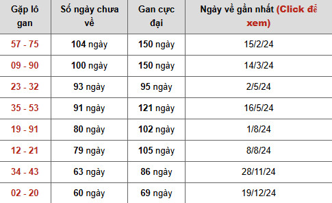Nổi bật nhất là cặp 57 – 75, hiện đã 104 ngày chưa xuất hiện trong khi gan cực đại ghi nhận 150 ngày. Khoảng cách tới đỉnh lịch sử còn khá lớn nhưng chu kỳ gan đã kéo dài rất sâu, cho thấy trạng thái tích lũy cực mạnh và có thể trở thành điểm trọng tâm khi cân nhắc phương án dự đoán xổ số miền bắc ngày 15/2/2026 chuẩn xác.