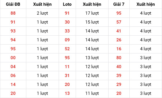 • Các số 91, 93, 94, 95, 00, 04, 06, 14, 20 (1 lượt) → phân bổ rải rác, chưa hình thành xu hướng rõ rệt.