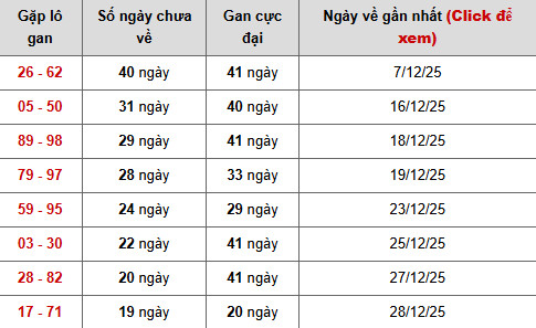 Nổi bật nhất là cặp 26 – 62, hiện đã 40 ngày chưa xuất hiện, chỉ còn cách mốc gan cực đại 41 ngày đúng 1 ngày, lần về gần nhất ghi nhận 07/12/2025. Trạng thái gan cận đỉnh kéo dài cho thấy áp lực giải tỏa đang ở mức rất cao, khiến cặp số này trở thành tâm điểm cần cân nhắc trong các phương án dự đoán xổ số miền bắc ngày 17/1/2026 chuẩn xác.