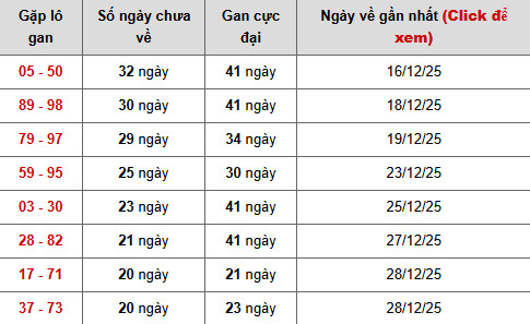 Nổi bật nhất là cặp 05 – 50, hiện đã 32 ngày chưa xuất hiện, trong khi mốc gan cực đại lên tới 41 ngày, lần về gần nhất ghi nhận 16/12/2025. Trạng thái gan cao, tiến sát vùng nhạy cảm cho thấy áp lực giải tỏa đang tăng dần, khiến cặp số này trở thành điểm cần cân nhắc trong các phương án dự đoán xổ số miền bắc ngày 18/1/2026 chuẩn xác.