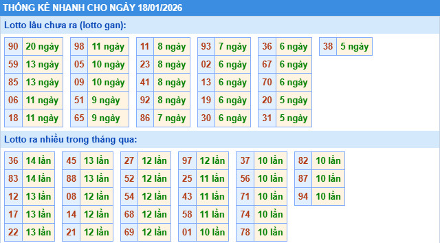 Thống kê – dự đoán XSMB ngày 18/1/2026 Thần Tài hôm nay mang đến cái nhìn tổng quan về XSMB chiều nay, tập trung vào các con số giải đặc biệt, lô có tần suất xuất hiện cao và lâu chưa về sau nhiều kỳ quay. Đây là cơ sở quan trọng để bạn đọc tham khảo khi theo dõi dự đoán XSMB 18/1 và lựa chọn bộ số phù hợp.
