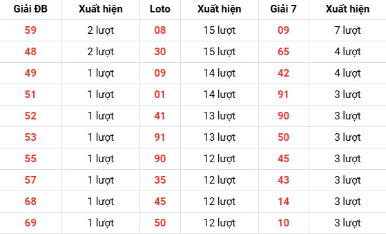 Hai số 59 và 48 tiếp tục là những giá trị có tần suất cao nhất với 2 lượt xuất hiện.