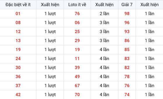 Nhóm số đặc biệt ít xuất hiện: 01, 08, 12, 13, 19, 24, 30, 36, 37, 42.
