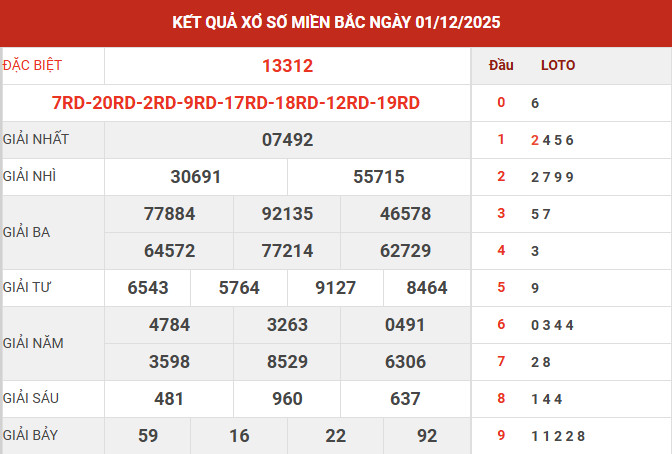 Ngày 1/12/2025, giải đặc biệt của Xổ số Miền Bắc thuộc về dãy số 13312, trong đó cặp 12 là tâm điểm dành cho những ai quan tâm tới các dấu hiệu lặp lại.