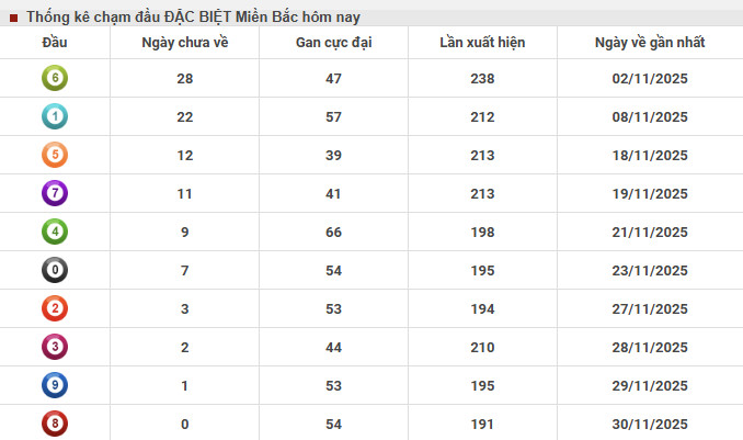 Thống kê cho thấy chạm đề lâu chưa xuất hiện nhất là chạm 6 (bao gồm 19 cặp số có chứa số 6), đã 20 ngày chưa ra.
