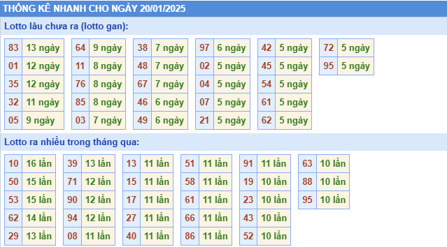 Mọi dữ liệu đều dựa trên thống kê kết quả XSMB những kỳ trước, nhận định hôm nay 20/1 và phân tích kỹ lưỡng, hỗ trợ người chơi lựa chọn con số may mắn với độ tin cậy cao.