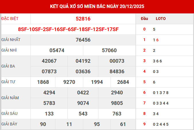 Ngày 20/12/2025, giải đặc biệt của Xổ số Miền Bắc thuộc về dãy số 52816, trong đó cặp 16 là tâm điểm dành cho những ai quan tâm tới các dấu hiệu lặp lại.