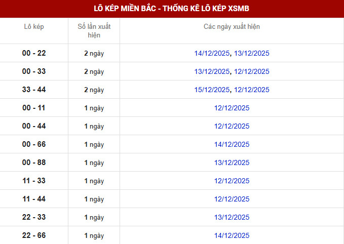 Thống kê đài xổ số miền Bắc chủ nhật lô tô kép biên độ mười ngày