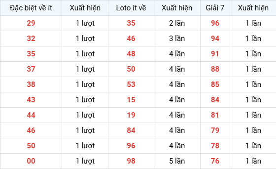Các số: 29, 32, 35, 37, 38, 43, 44, 46, 50, 00 đều xuất hiện 1 lượt
