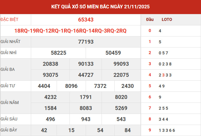 Ngày 21/11/2025, giải đặc biệt của Xổ số Miền Bắc thuộc về dãy số 65343, trong đó cặp 43 là tâm điểm dành cho những ai quan tâm tới các dấu hiệu lặp lại.