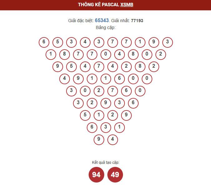 - Dựa vào thống kê Pascal, tham khảo cặp số đặc biệt dễ ra : 94 - 49