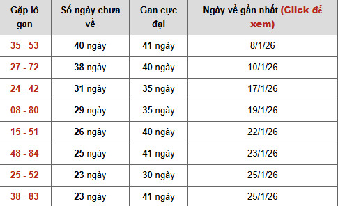 Nhóm 24 – 42 hiện ghi nhận 31 ngày gan so với gan cực đại 35 ngày, lần về cuối 17/01/2026. Biên độ gan tương đối lớn cùng khoảng cách không còn xa đỉnh lịch sử cho thấy cặp số này vẫn còn dư địa tăng áp lực và phù hợp theo dõi ở khung trung hạn.