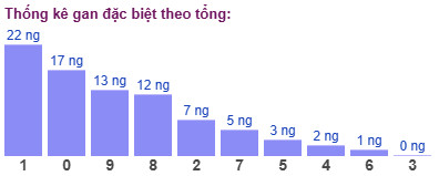 Thống kê cho thấy tổng đề lâu chưa xuất hiện nhất là tổng 1 (bao gồm 10 cặp số: 01, 10, 29, 38, 47, 56, 65, 74, 83, 92) đã 22 ngày chưa ra.