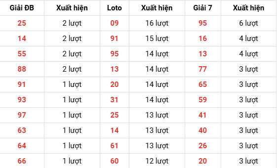 25, 14, 61 (13 lượt) → xuất hiện đều.