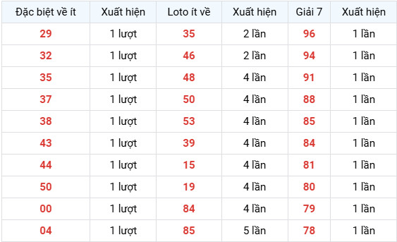 Các số: 29, 32, 35, 37, 38, 43, 44, 50, 00, 04 đều xuất hiện 1 lượt