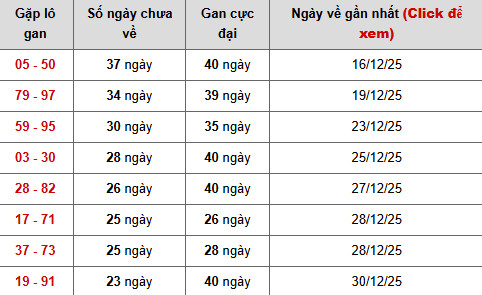 Nổi bật nhất là cặp 05 – 50, hiện đã 37 ngày chưa xuất hiện, chỉ còn cách mốc gan cực đại 40 ngày đúng 3 ngày, lần về gần nhất ghi nhận 16/12/2025. Trạng thái gan cao kéo dài cho thấy áp lực giải tỏa đang tăng dần, khiến cặp số này trở thành điểm đáng lưu ý trong các phương án ự đoán xổ số miền bắc ngày 23/1/2026 chuẩn xác.