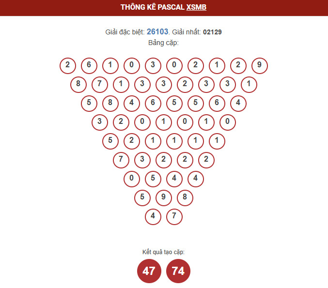 - Dựa vào thống kê Pascal, tham khảo cặp số đặc biệt dễ ra : 47 - 74