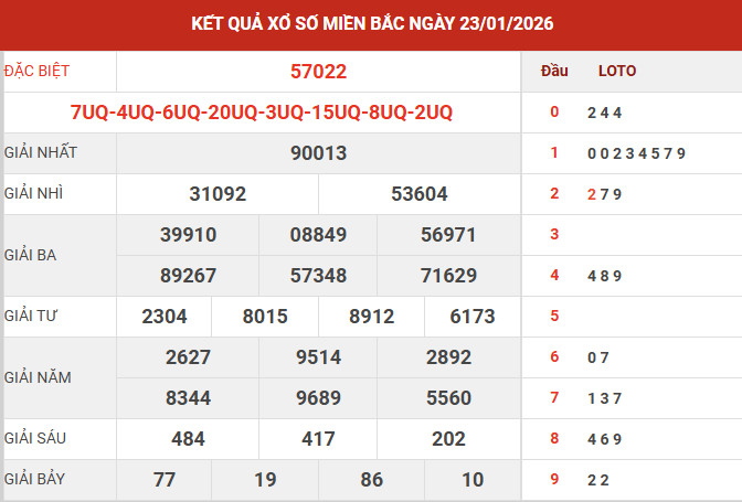 Căn cứ vào bảng kết quả xổ số miền Bắc ngày 23/1/2026 vừa được công bố, các chuyên gia tiến hành tổng hợp và phân tích các số liệu trọng tâm, qua đó mang đến những nhận định chi tiết nhằm hỗ trợ bạn đọc tham khảo và dự đoán XSMB 24/1/2026 một cách hiệu quả.