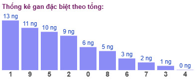 Thống kê cho thấy tổng đề lâu chưa xuất hiện nhất là tổng 1 (bao gồm 10 cặp số: 01, 10, 29, 38, 47, 56, 65, 74, 83, 92) đã 13 ngày chưa ra.