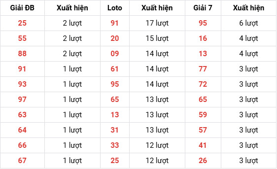• Các số 91, 93, 97, 63, 64, 66, 67 (1 lượt) → xuất hiện rải rác, chưa có xu hướng rõ ràng.